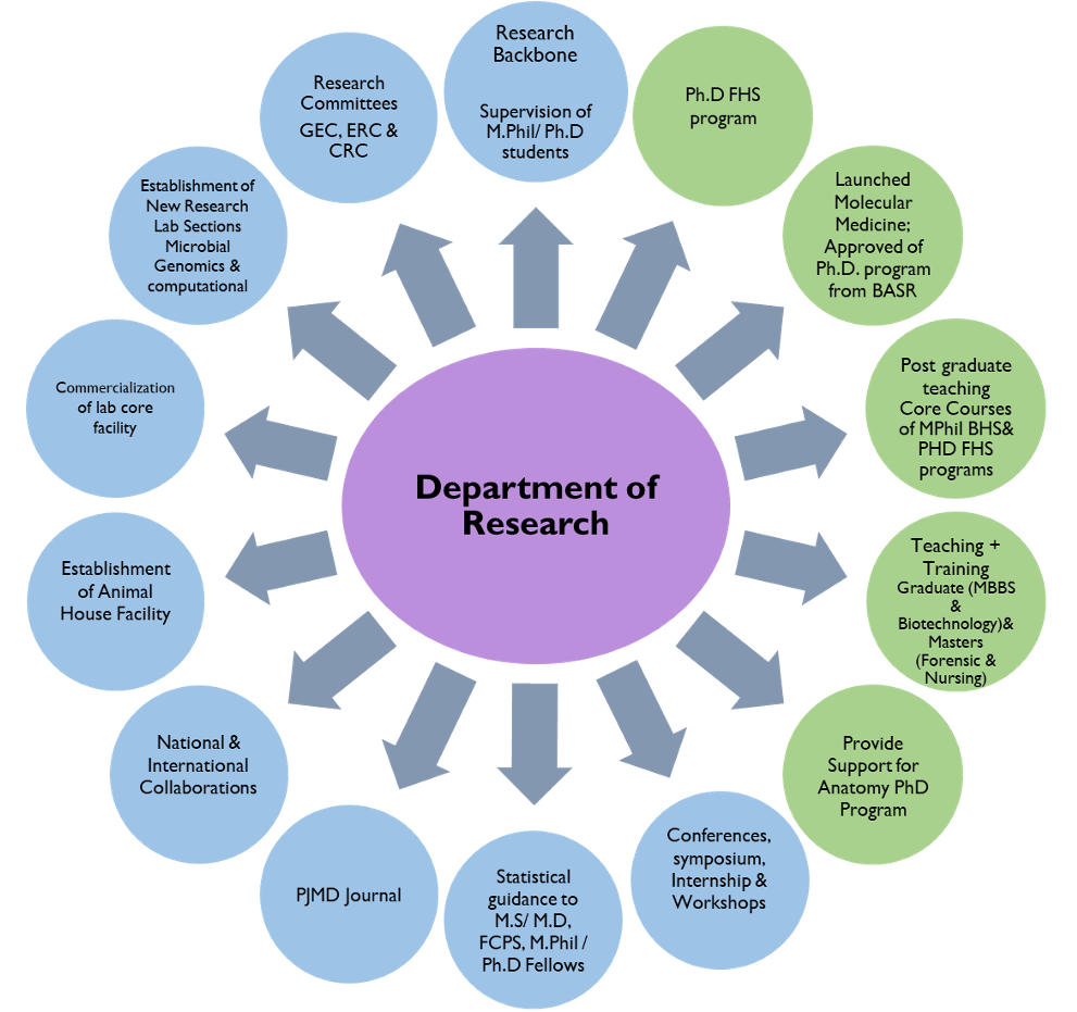 Advancing research and developing the University’s reputation as the most renowned private sector academic research-based institution. Cutting-edge clinical and translational research- bringing medical innovation to patient care and industry. Promotion of independent research projects in all fields of degree-based programs with a drive for lifelong learning through creativity, innovative research and commercialization. Ensuring that research meets the highest ethical and quality standards through open transparent processes.